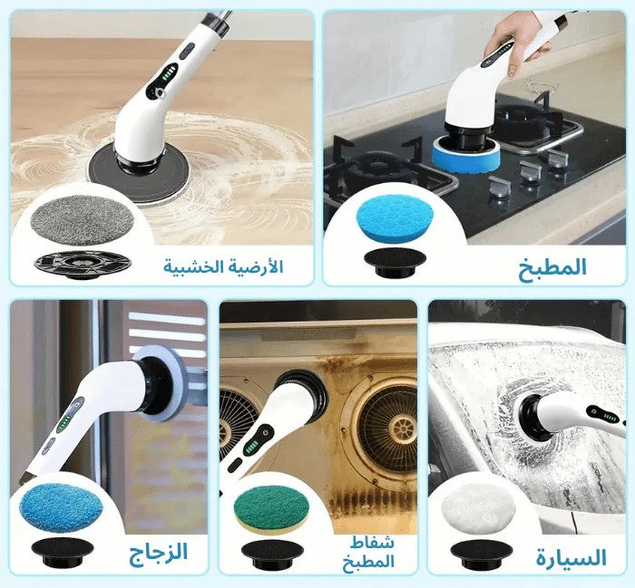 نعم، الفرشاة تأتي مع مجموعة رؤوس متعددة تناسب مختلف الأسطح، مما يجعلها أداة مثالية لتنظيف إطارات السيارات (الجنوط)، مقاعد الجلد، وحتى أرضيات الحوش والمسابح دون أن تسبب أي خدوش.
